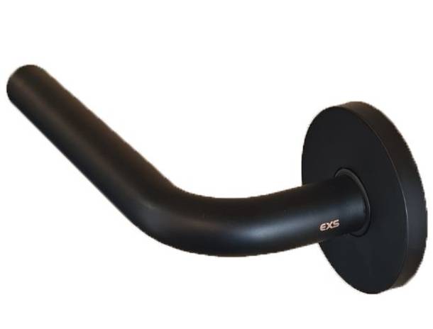 Paire de béquilles sur rosaces rondes à visser, L16 mm modèle "Project 01", conforme à la norme EN1906 grade 4. Rosaces intégrant un ressort de rappel + douilles pour vis traversantes pré-montées et sous construction acier inoxydable. Finition epoxy noir mat 9005