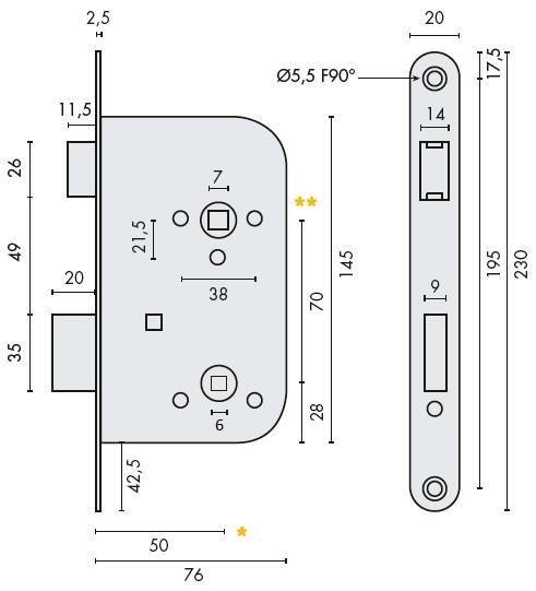 Coffre de serrure bec de cane à condamnation, axe à 50 mm, NF, pêne réversible, têtière noire, bouts ronds, entraxe 70, gâche en sus.