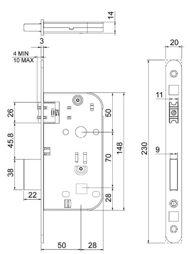 Coffre de serrure condamnation à rouleau axe à 50 mm têtière inox, bouts ronds, entraxe 70, gâche en sus.